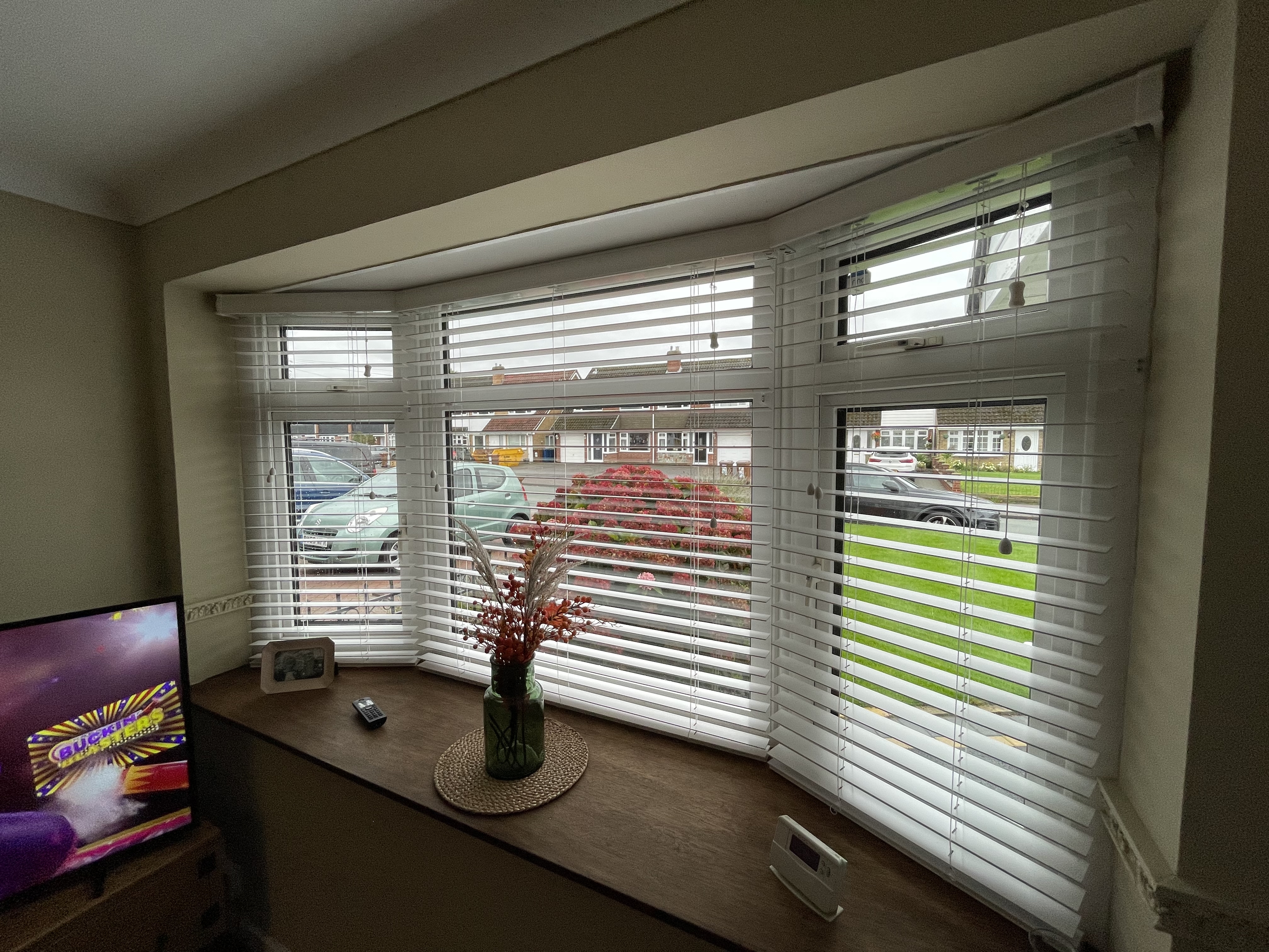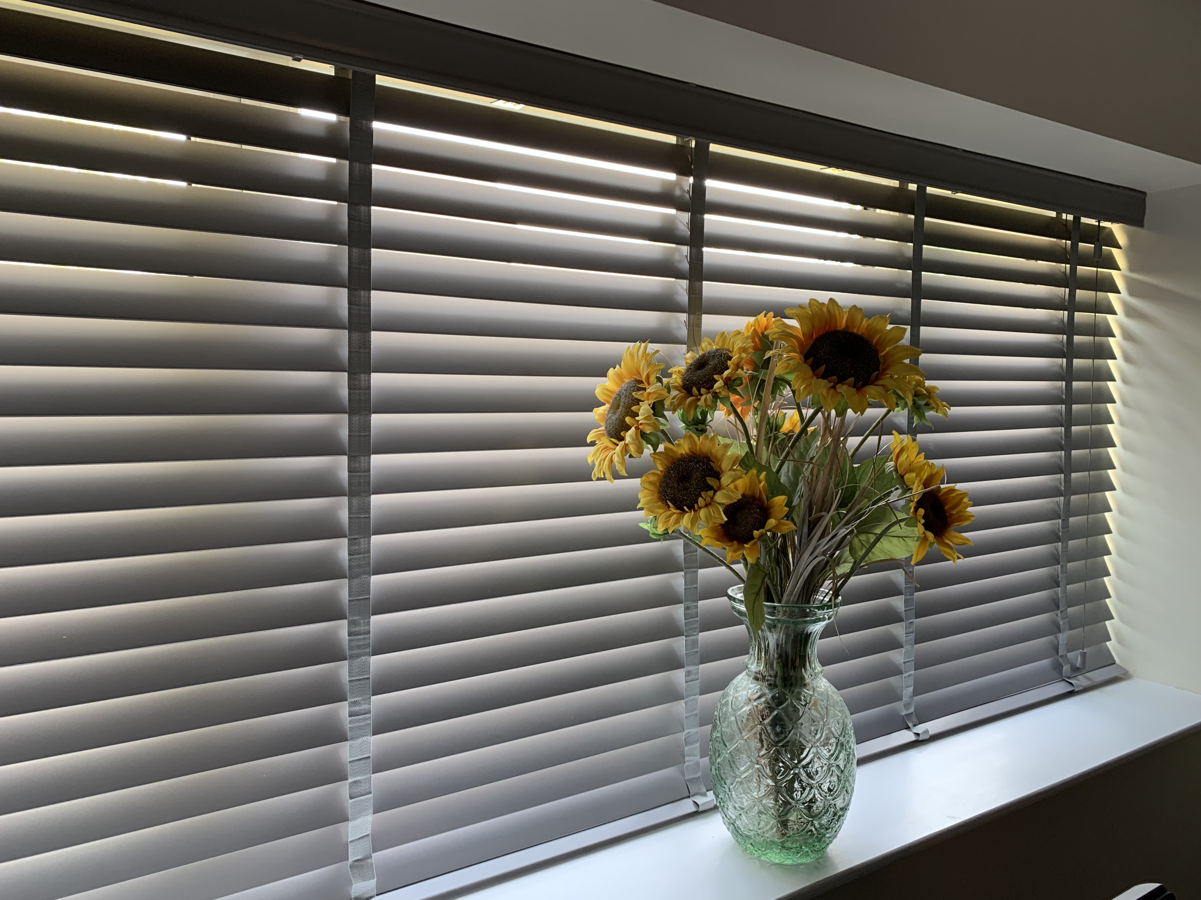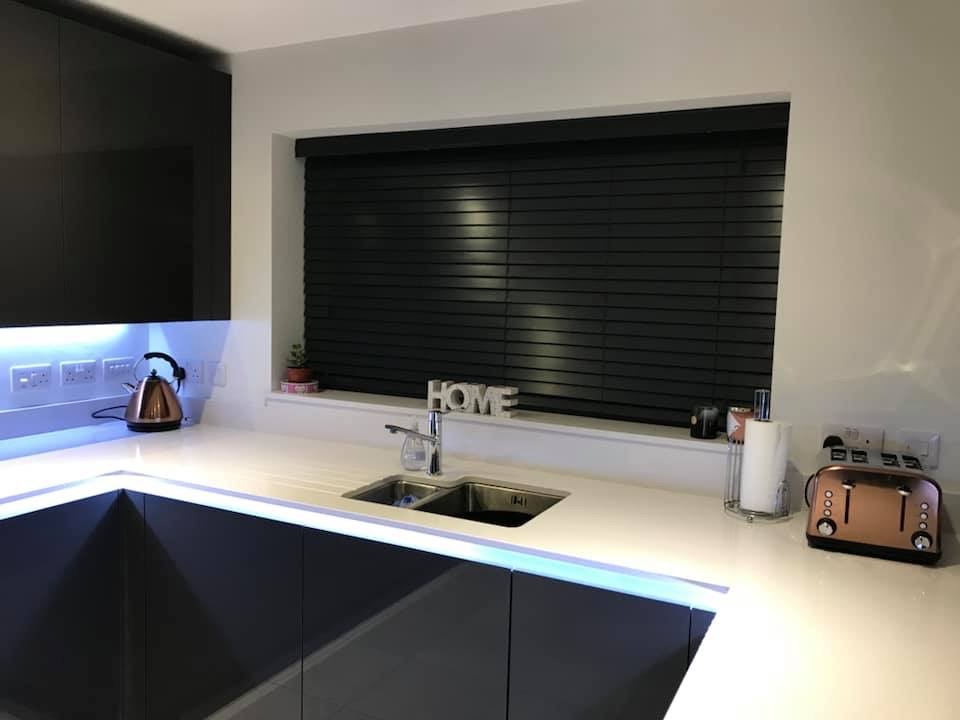 We also offer you our Faux Wood range which come in a 38mm and 50mm These are suitable for areas like bathrooms, kitchens and areas with a high temperature. Easy clean and they can be made up to 2.4 metres wide.